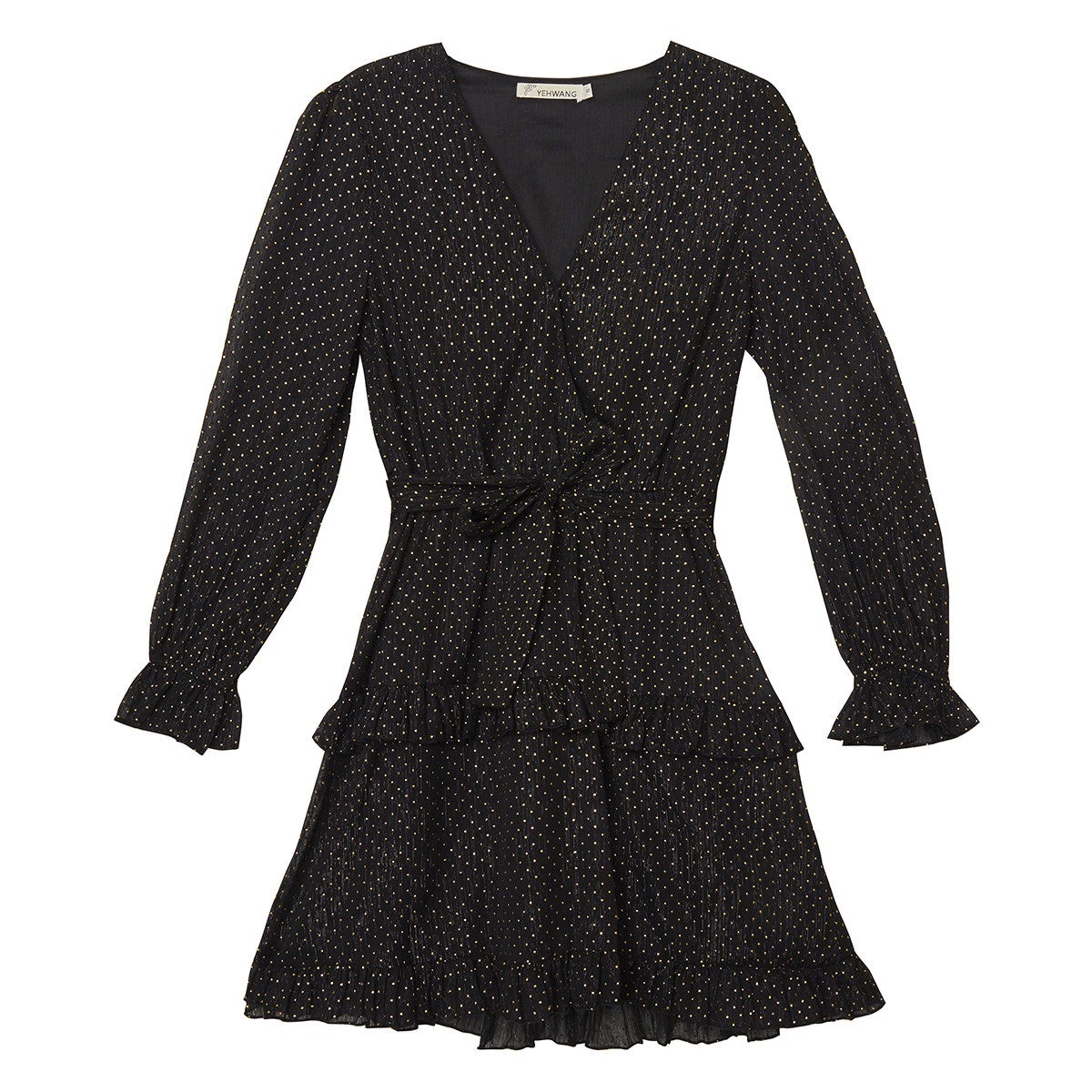Jurkje met V-hals, lange mouw, taille boord en roezels.