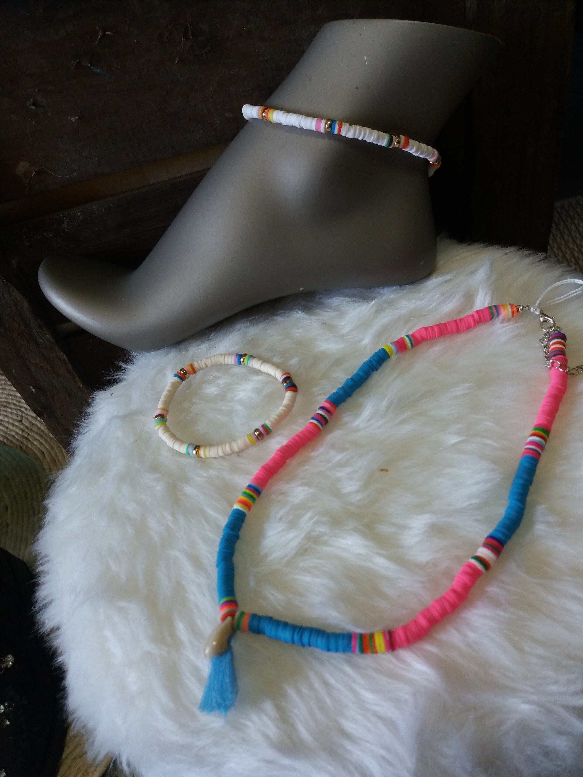 Surfketting/ choker met schelp en kwastje in blauw/roze