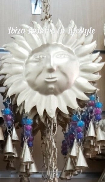 Zon hanger van vergrijst metaal, met fleurige kralen en bellen.