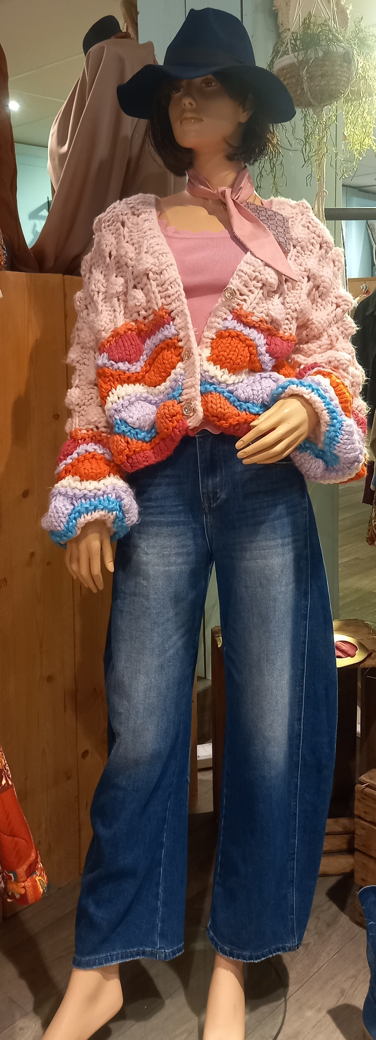 Grof gebreid vest met pofmouw en een glimmertje in de 3 knopen aan de voorkant