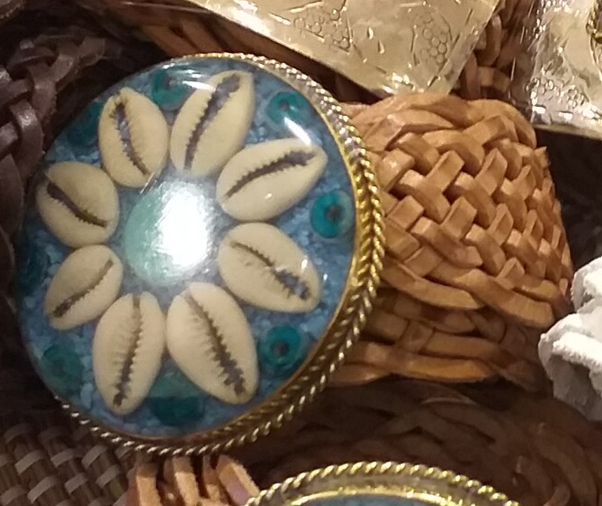 Leren, cognac gevlochten riem met ronde blauwe gesp met schelpen.