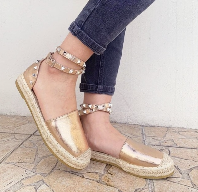 Espadrilles met jute zool en enkelbandjes met studs.