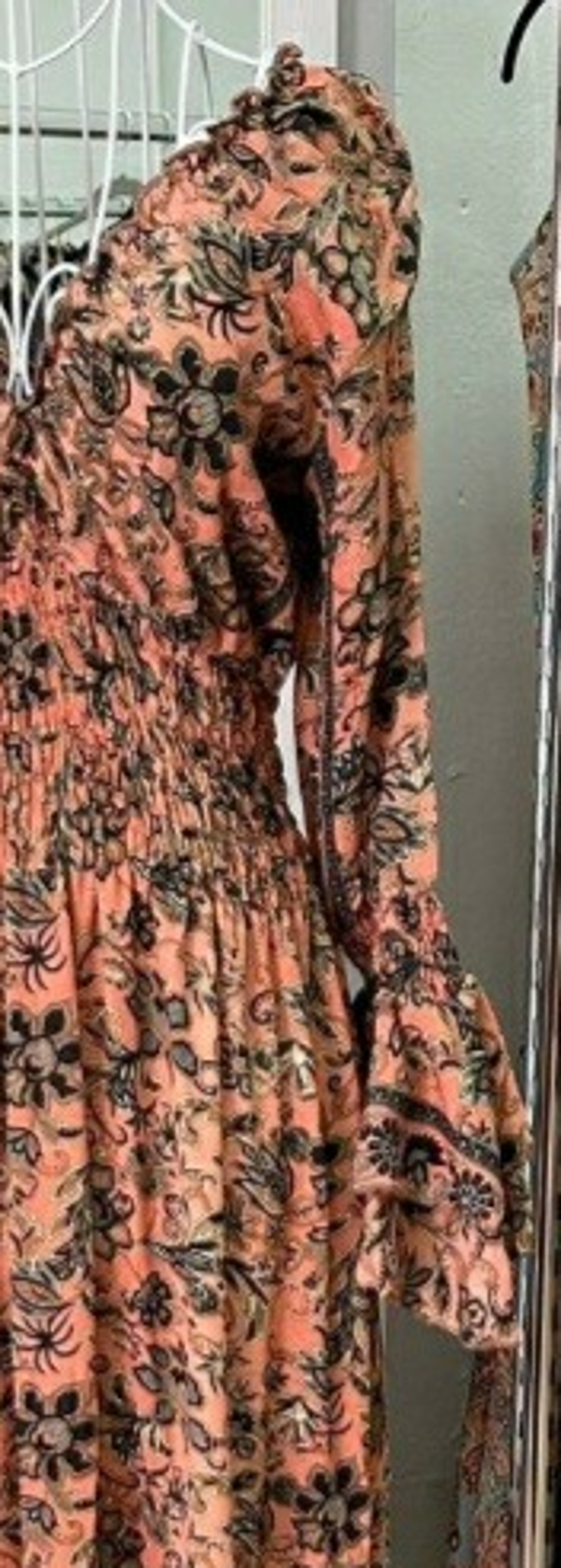 Soepel vallende zijde maxijurk met V-hals voor en achter, afgewerkt met smockranden.