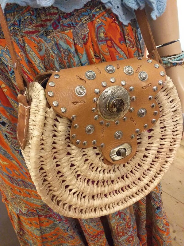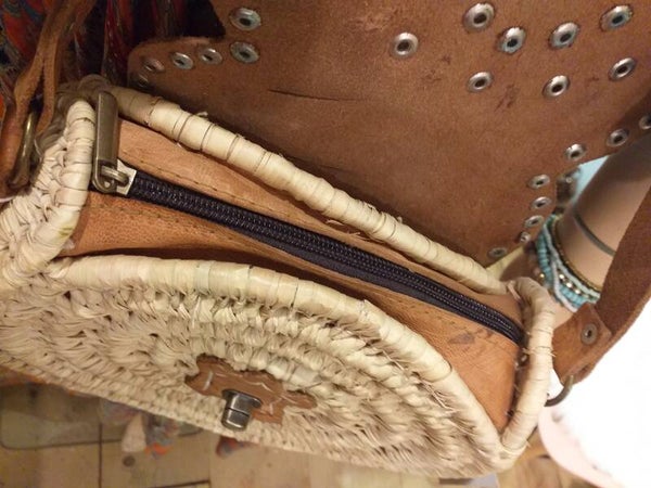 Verstevigde, rieten, ronde tas met ritssluiting en klep