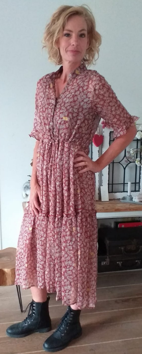 Zwierige lange jurk met roezels, stroken en opstaand boordje en taillekoord.