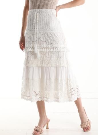 Gevoerde midirok met kant en kwastjes.